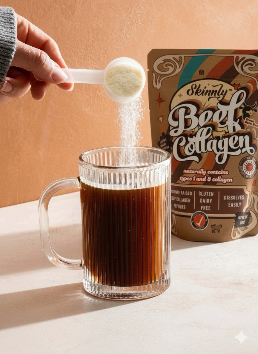 Shop Beef CollagenGet your glow on with our Skinnly bovine collagen. Sourced from grass-fed, pasture-raised cows in Argentina for pure, premium quality. Dissolves instantly in coffee without altering the flavor!